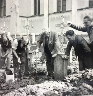 Die Gauleitung legte grossen Wert darauf, dass die Exhumierung rein zivilen Charakter hatte. Dies sollte auch aus der Fotodokumentation hervorgehen, die sie anordnete. In Eile hatten vor dem angesetzten Termin einige Gehilfen der Gestapo ein paar von den Invasoren im Jahre 1938 umgekippte Grabsteine wiederaufgerichtet. Pünktlich um vier Uhr begannen unter Aufsicht eines Gestapotrupps Leichenbestatter Hämmerle und Sohn, den Bestattungsort Alberik Zwyssigs freizuschaufeln. Neben der Grabstätte stand ein Zinnsarg zur Aufnahme der Gebeine bereit.